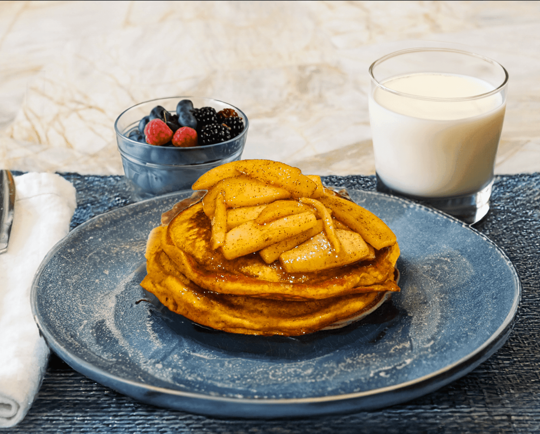 - Serve the pancakes with apple topping, drizzle with maple syrup, and serve with fresh fruit and milk.