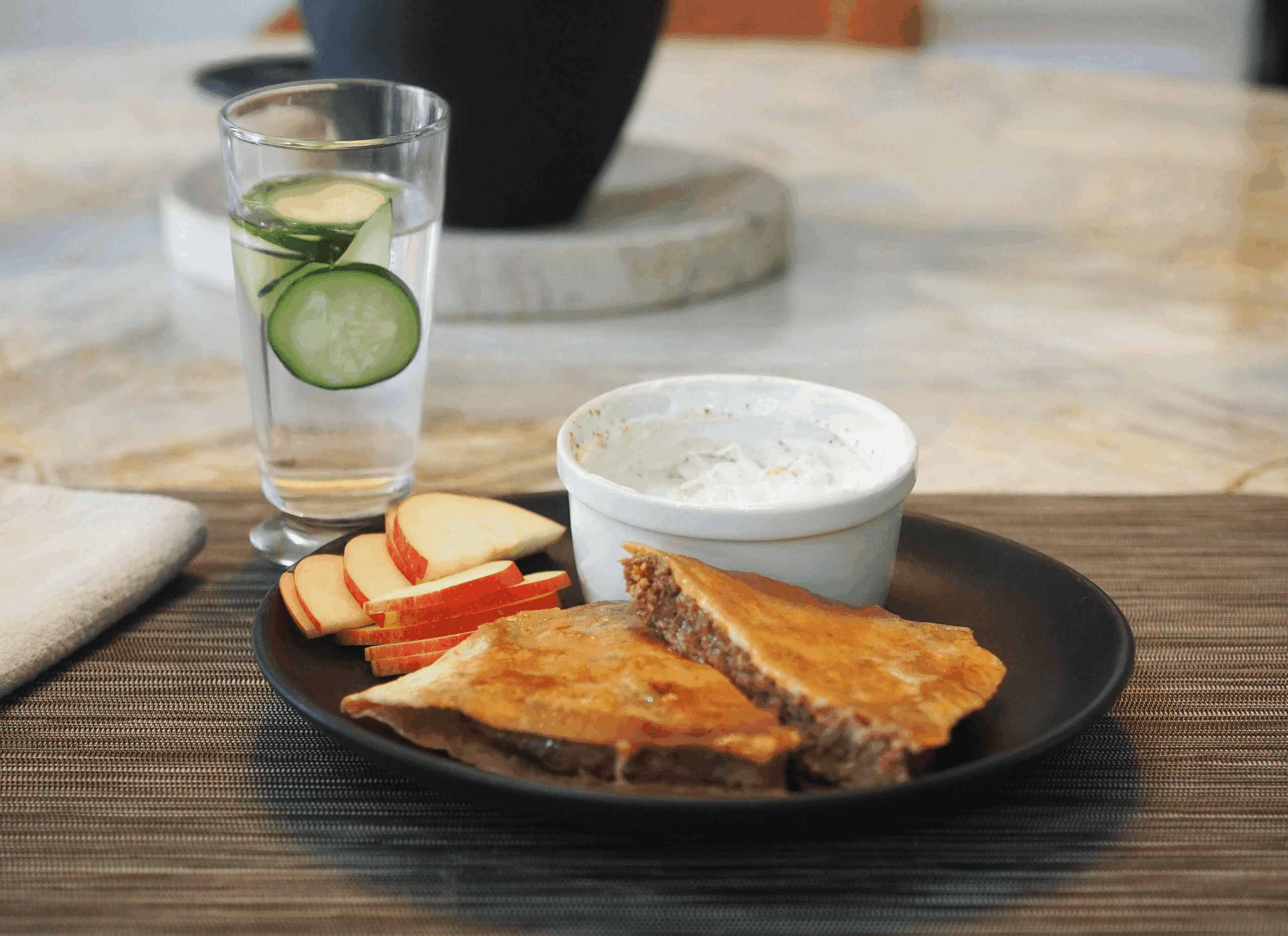 • Serve the arayes with sauce, apple slices and cucumber water.