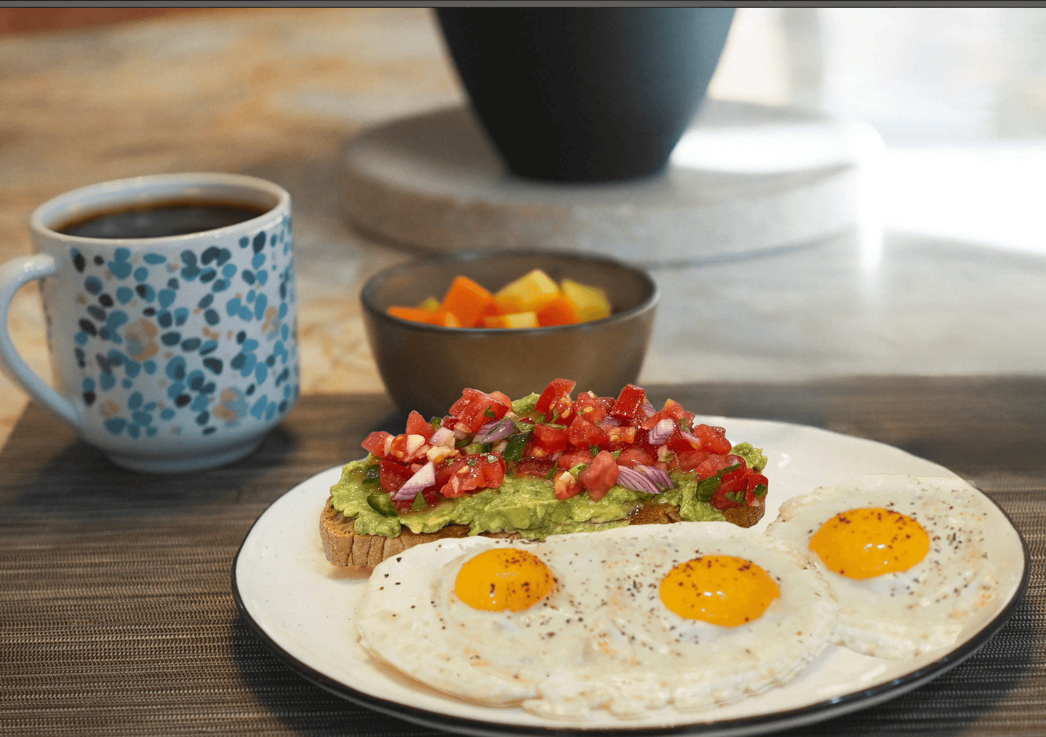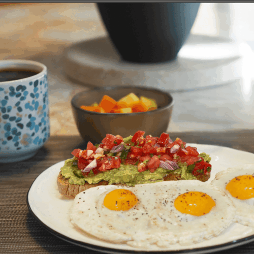- Serve the avocado toast with three eggs per serving, fresh fruit, and coffee. Enjoy your balanced and satisfying breakfast.