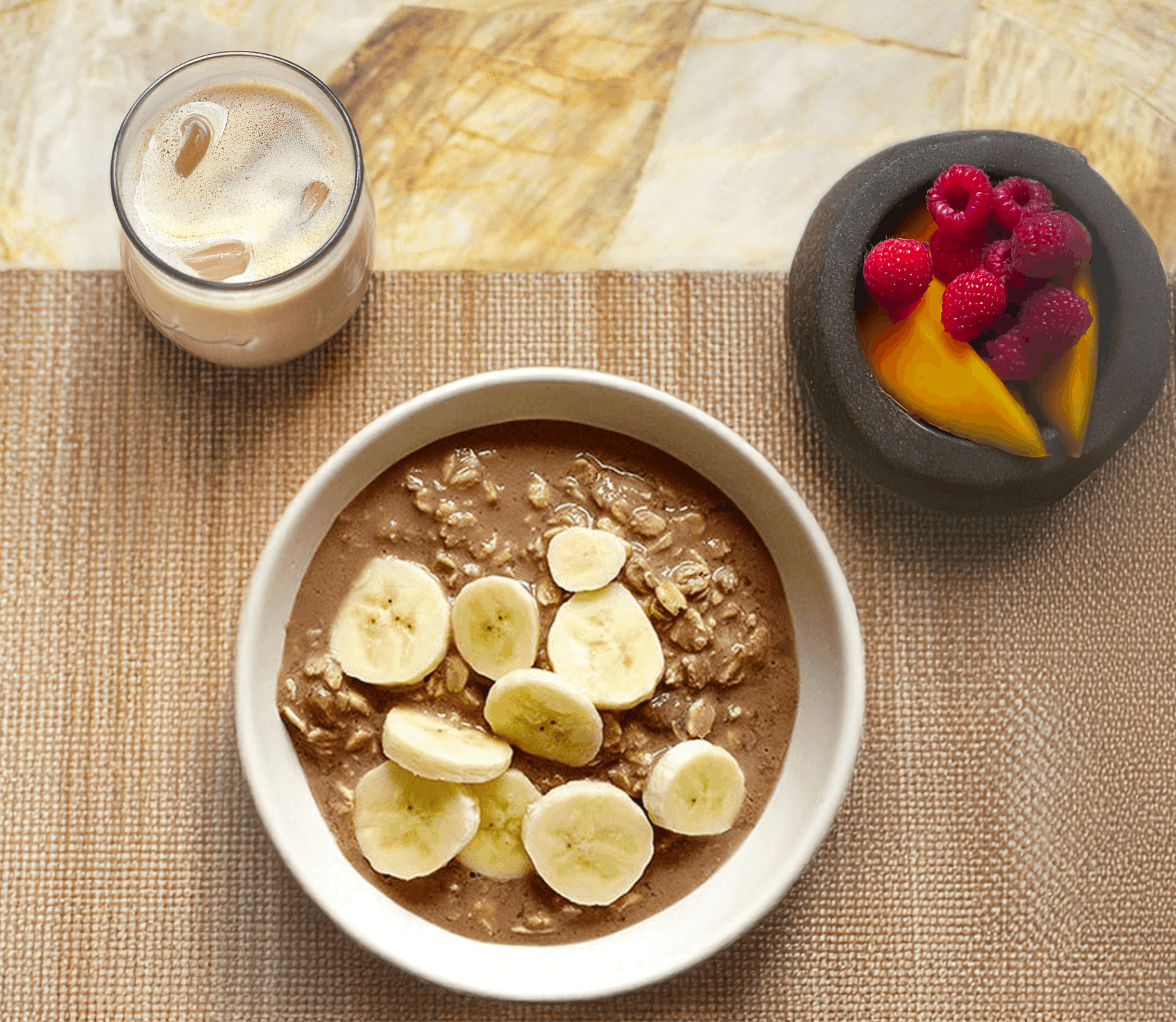 • Serve the oatmeal topped with banana alongside fruit and cold brew coffee.