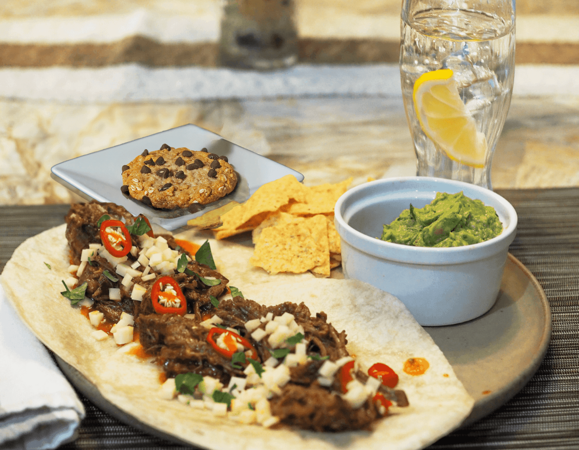 - Assemble the tacos: Fill each taco shell with shredded beef. Top with tomato, cheddar cheese, and jalapeño (if using). Serve with guacamole, tortilla chips, banana oatmeal cookies, and lemon sparkling water. Enjoy!