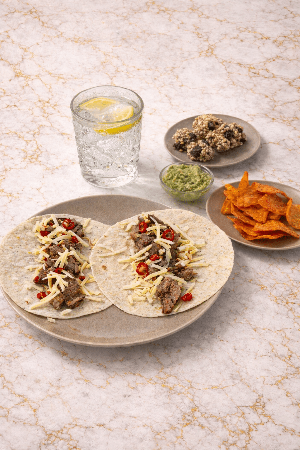 • Serve the tacos with guacamole and chips, banana oatmeal cookies, and lemon sparkling water.