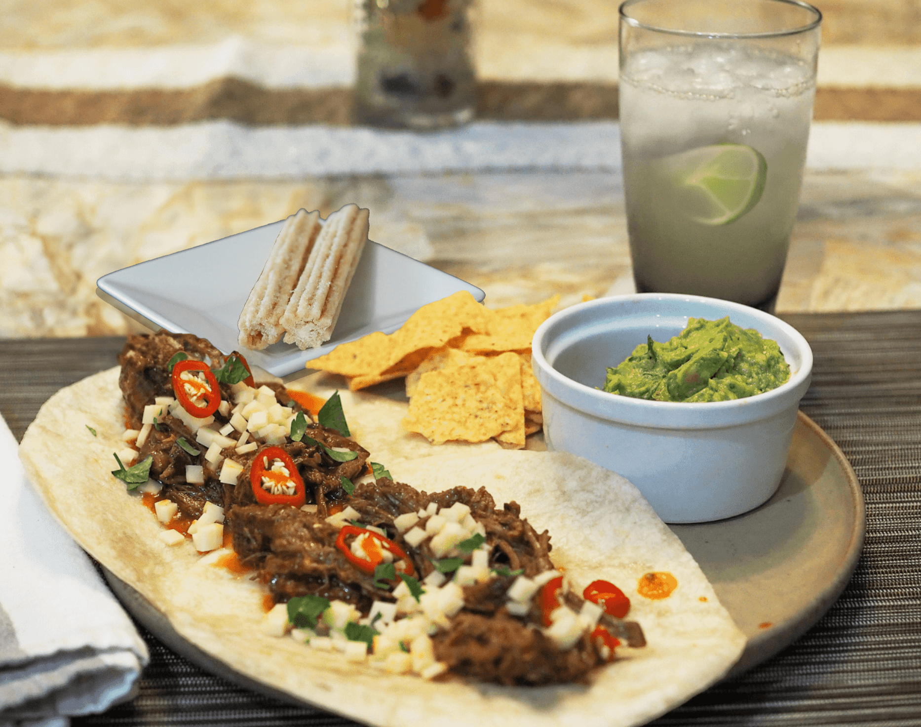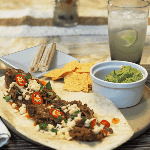 • Serve tacos with guacamole and tortilla chips, churros, and virgin margarita. Enjoy!