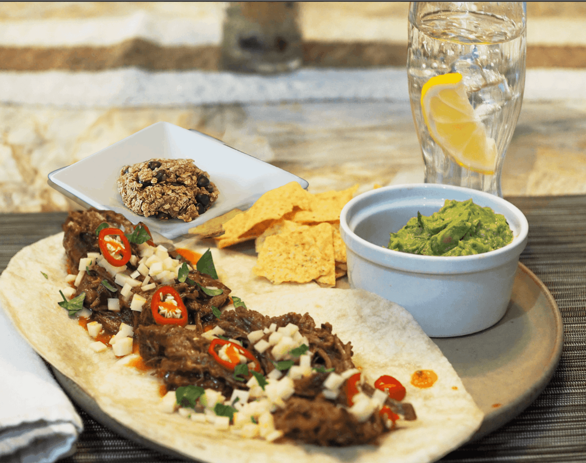 - Fill each taco shell with shredded beef. Top with tomato, cheddar cheese, and jalapeño (if using). Serve with guacamole, tortilla chips, cookies, and lemon sparkling water. Enjoy!