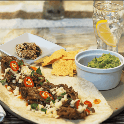 • Serve the tacos with tortilla chips, guacamole, lemon sparkling water, and banana oatmeal cookies for dessert.