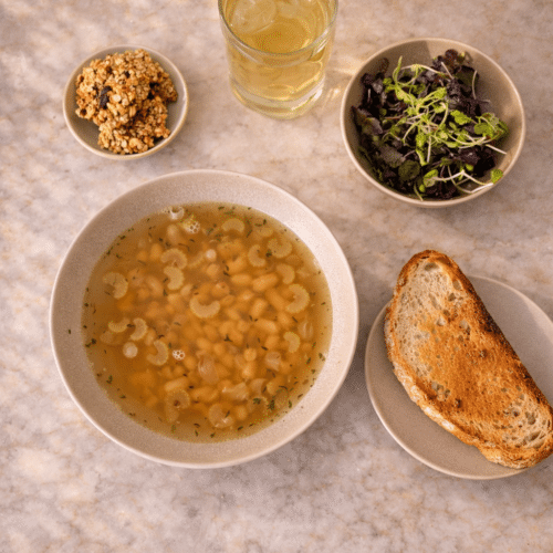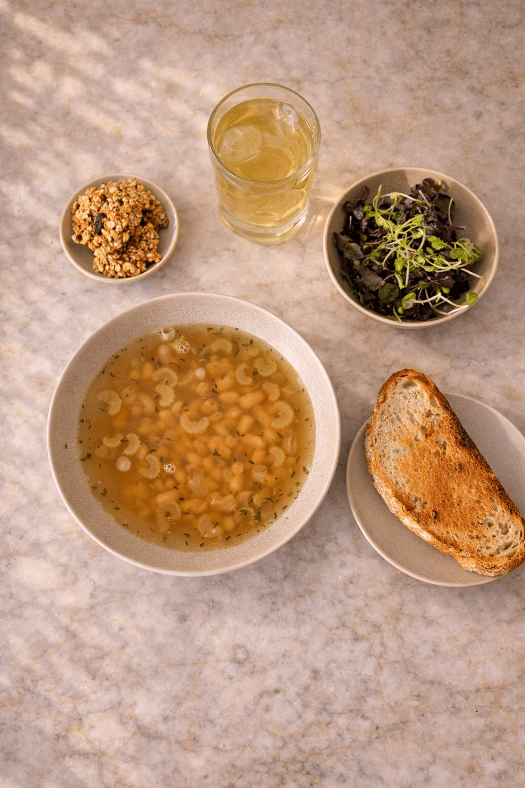- Serve the soup with toasted bread, microgreen salad, iced ginger tea, and banana oatmeal cookies.