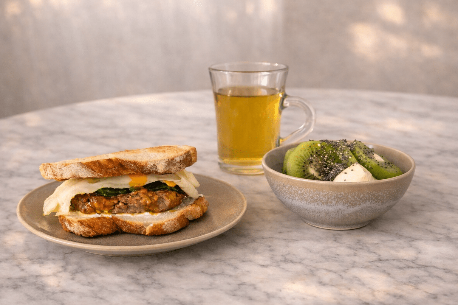 - Spread goat cheese evenly over toasted sourdough slices. Top with beef patties, sautéed spinach, and eggs. Close the sandwiches with the remaining bread slices.