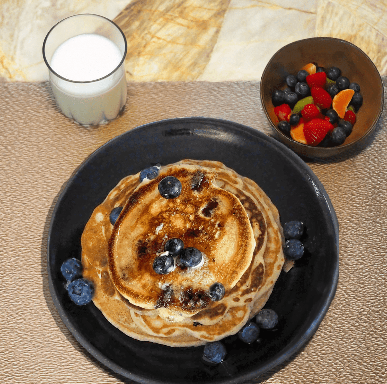 - Serve the pancakes with maple syrup, fresh fruit and milk.
