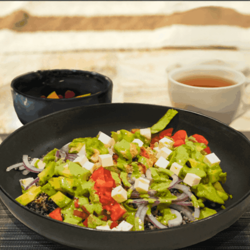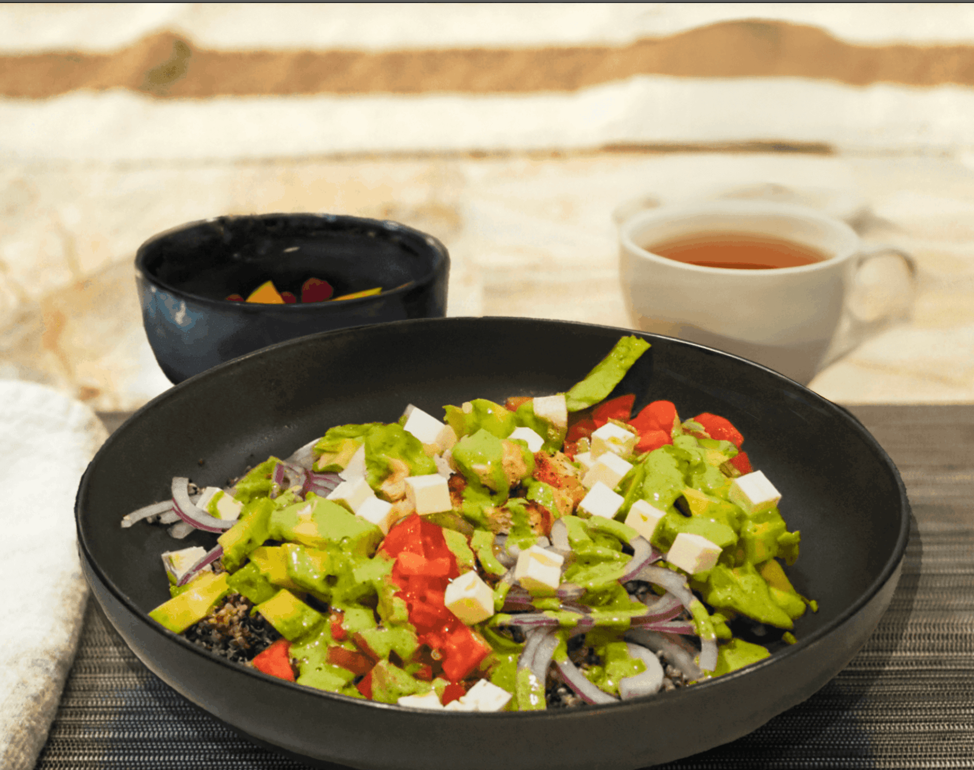 - Portion the quinoa into then top with grilled chicken, tomato, cucumber, avocado, feta cheese, and red onion. Drizzle with the prepared sauce.