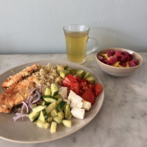 - Assemble the Buddha bowl by portioning the quinoa and top with romaine lettuce, grilled chicken, tomato, cucumber, avocado, feta cheese, and red onion. Drizzle with the prepared sauce.