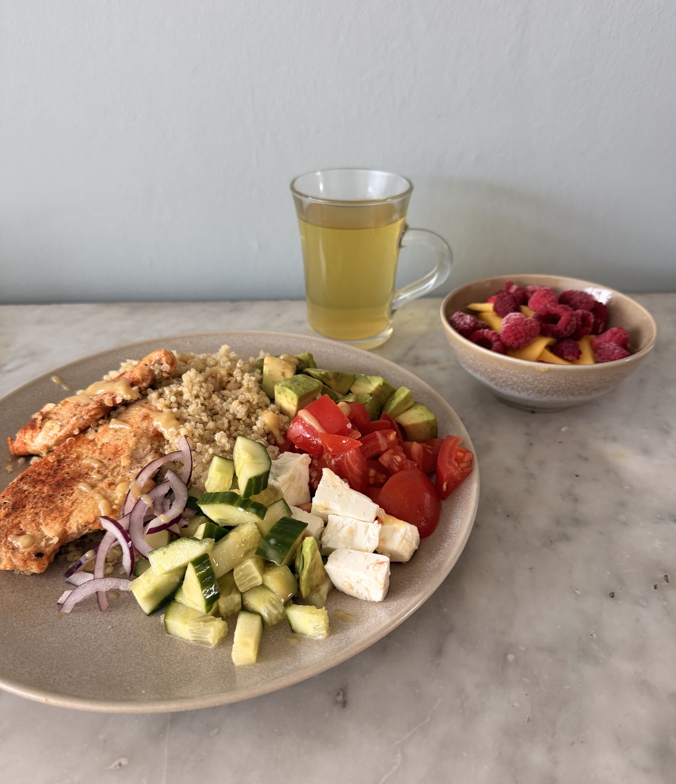- Assemble the Buddha bowl by portioning the quinoa and top with romaine lettuce, grilled chicken, tomato, cucumber, avocado, feta cheese, and red onion. Drizzle with the prepared sauce.