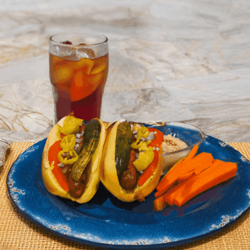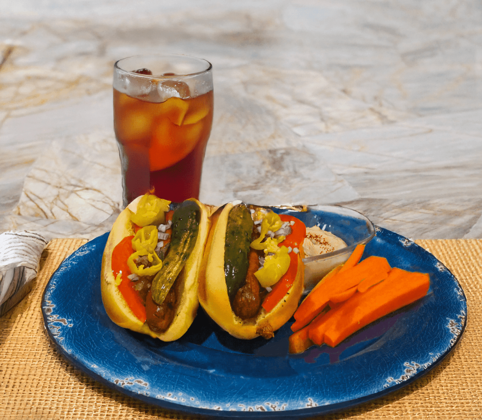 - Assemble the Hot Dogs: Open the buns and place tomato slices along one side. Place a hot dog in the middle and a pickle spear on the other side. Spread relish along the top. Evenly distribute pepperoncini and minced onion. Sprinkle with celery salt and top with mustard.