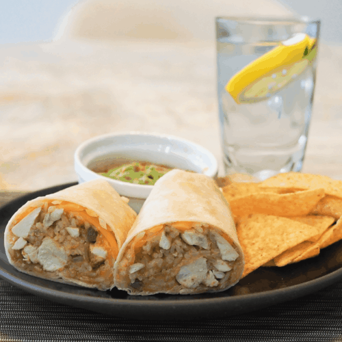 • Enjoy chicken and rice burrito with chips and guac and lemon sparkling water.