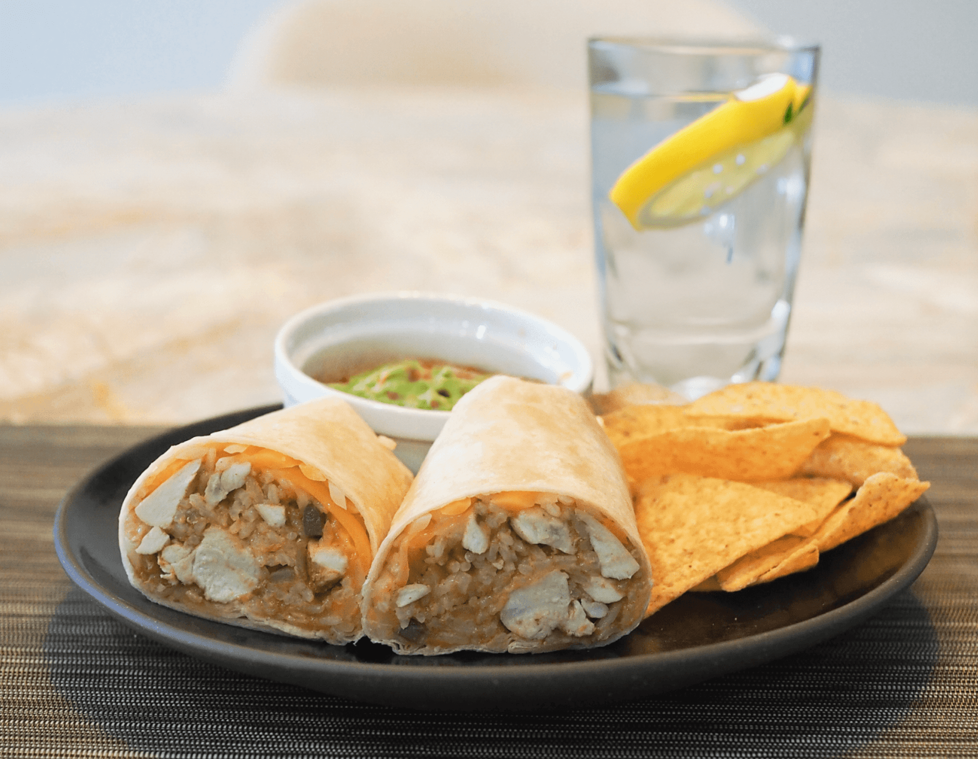 • Enjoy chicken and rice burrito with chips and guac and lemon sparkling water.