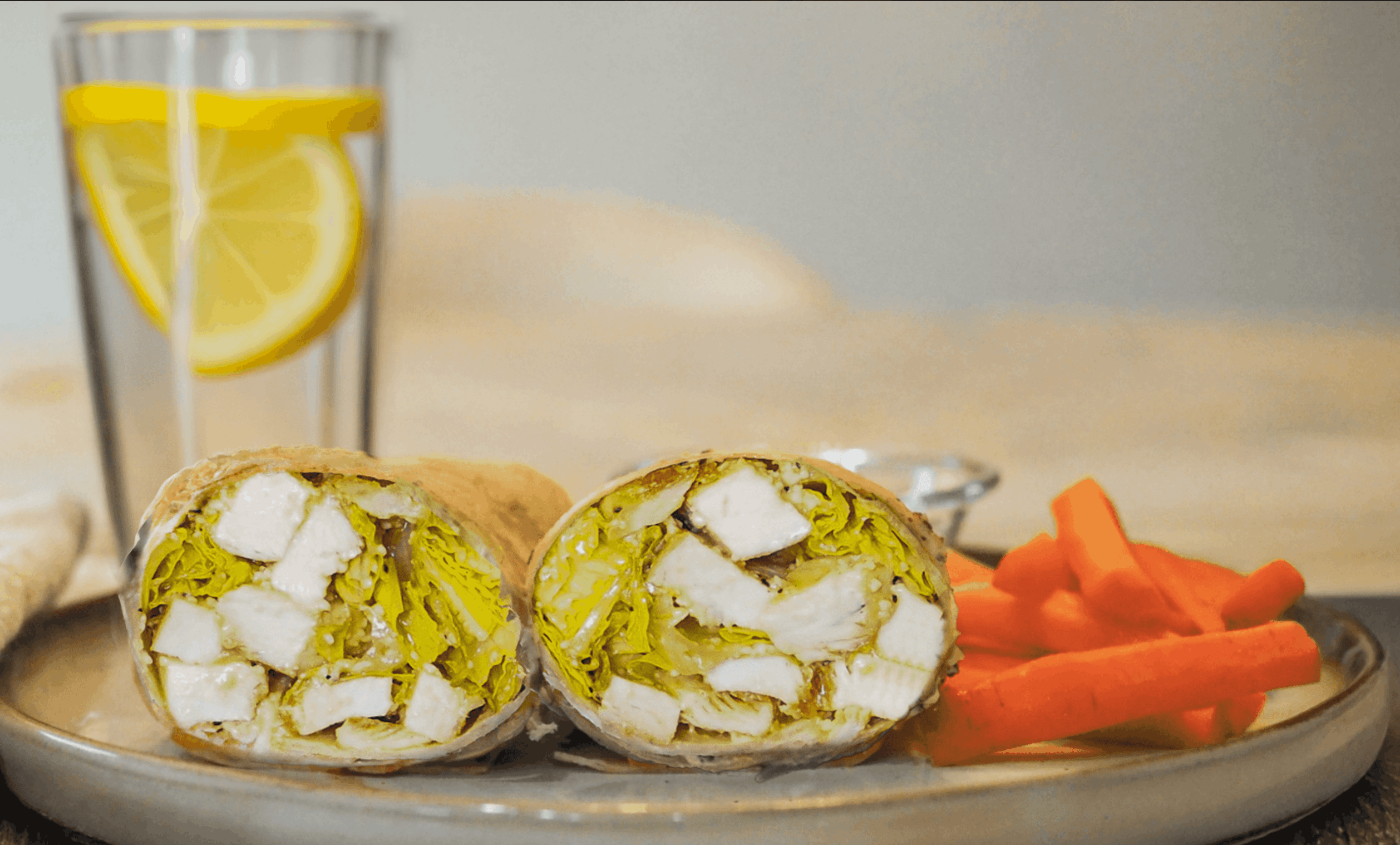 • Serve the chicken Caesar salad wraps with carrots and hummus alongside lemon sparkling water.