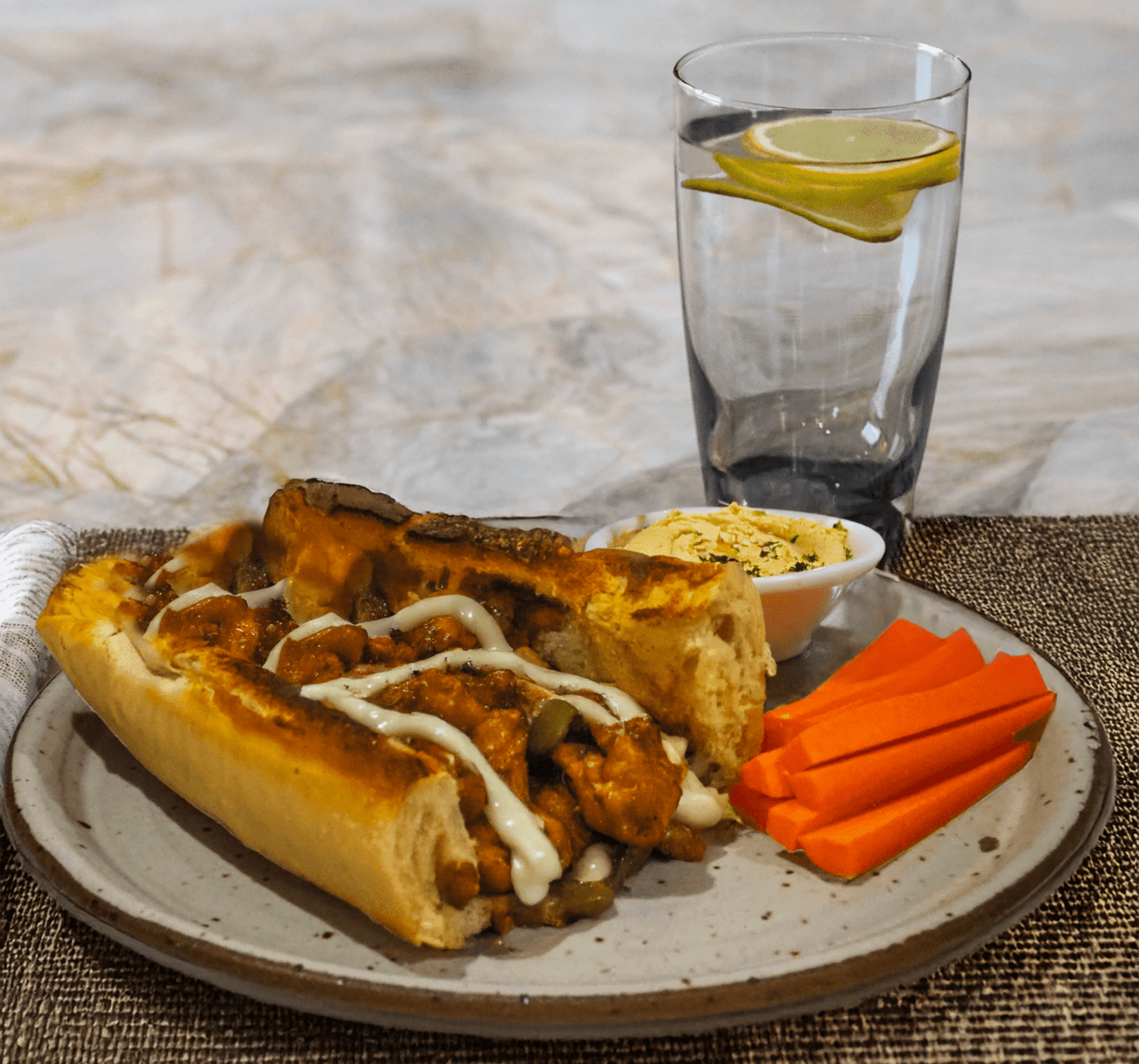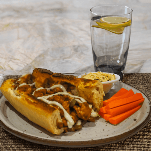 - Serve the sandwich with carrot sticks, hummus, and lemon sparkling water.