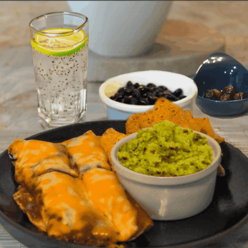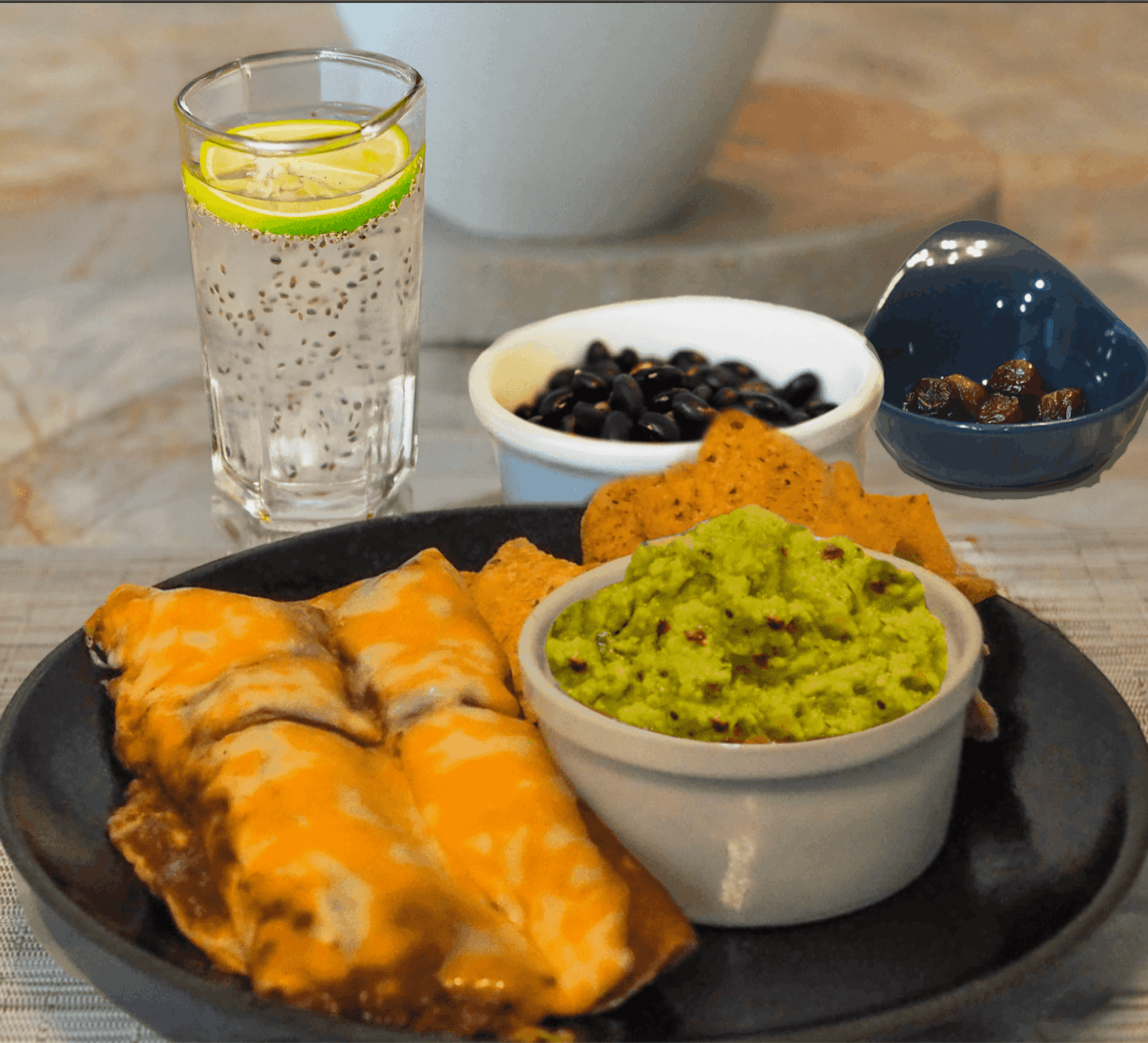 - Serve the enchiladas with rice, black beans, chips and guacamole, lime chia sparkling water, and dates.