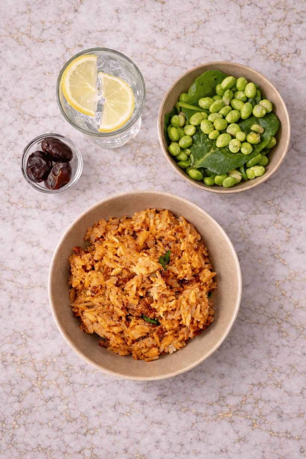 • Portion the chicken and orzo and serve alongside salad, lemon sparkling water, and dates for dessert.