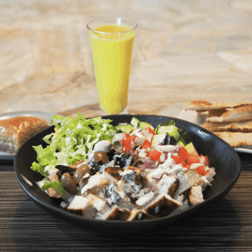 • Serve the shawarma bowl with mango lassi, and baklava for dessert.