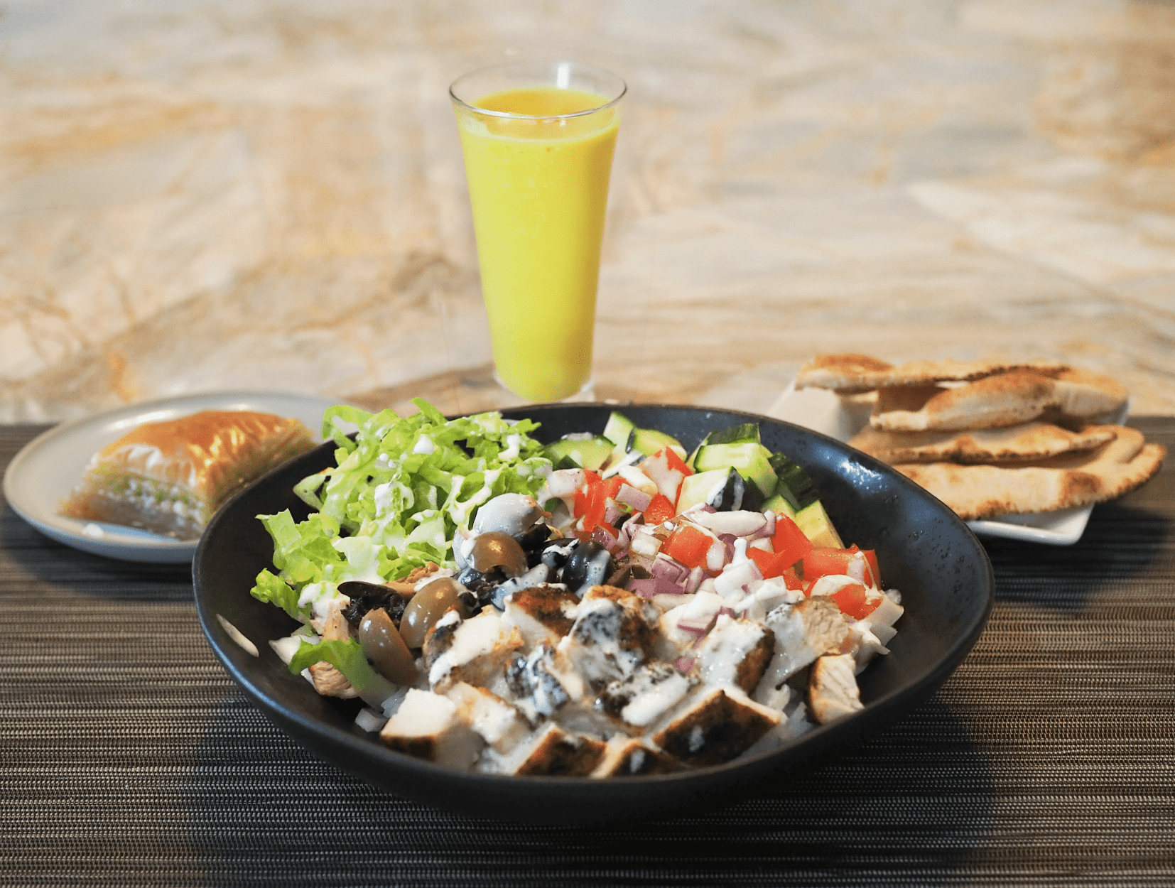 • Serve the shawarma bowl with mango lassi, and baklava for dessert.