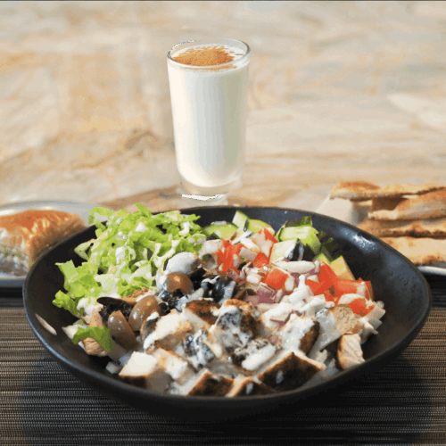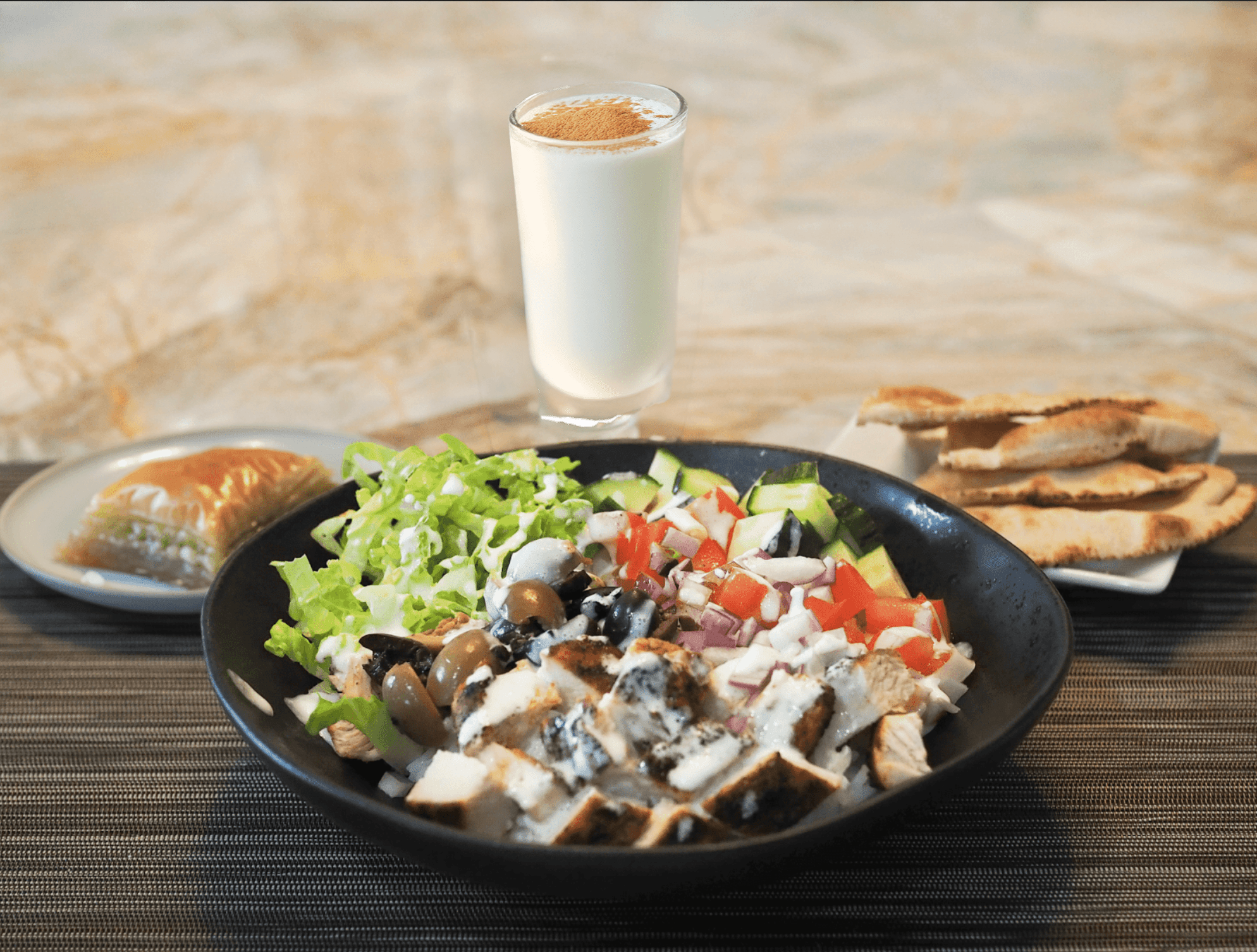• Serve the shawarma bowl with pita, cinnamon protein milk, and baklava.