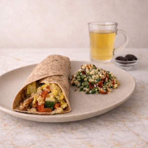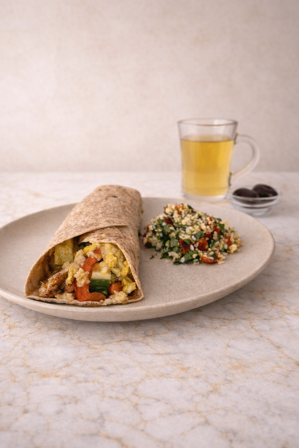 - Serve the shawarma wrap with tabbouleh, chamomile tea, and dates for dessert.
