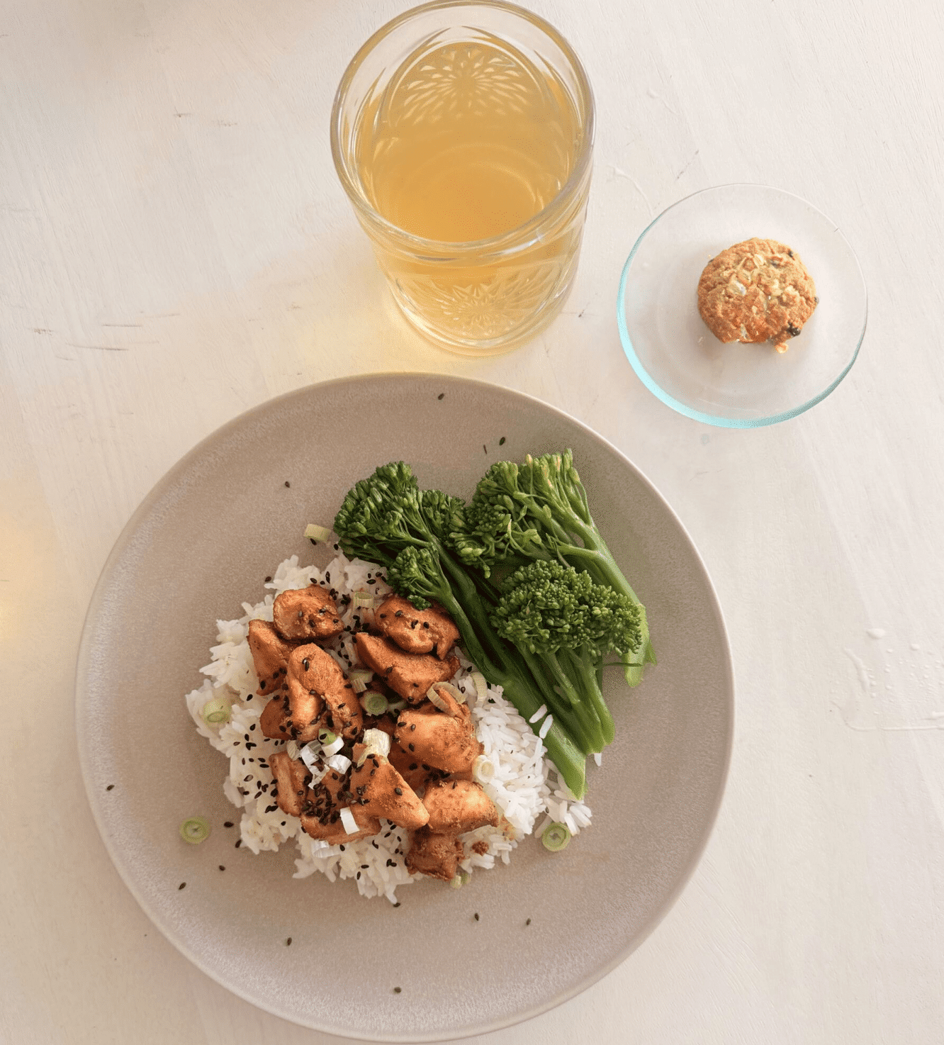 - Serve the chicken teriyaki over rice, garnish with scallions and sesame seeds, and serve with broccolini, unsweetened iced ginger tea, and Divine Dish banana oatmeal cookies.