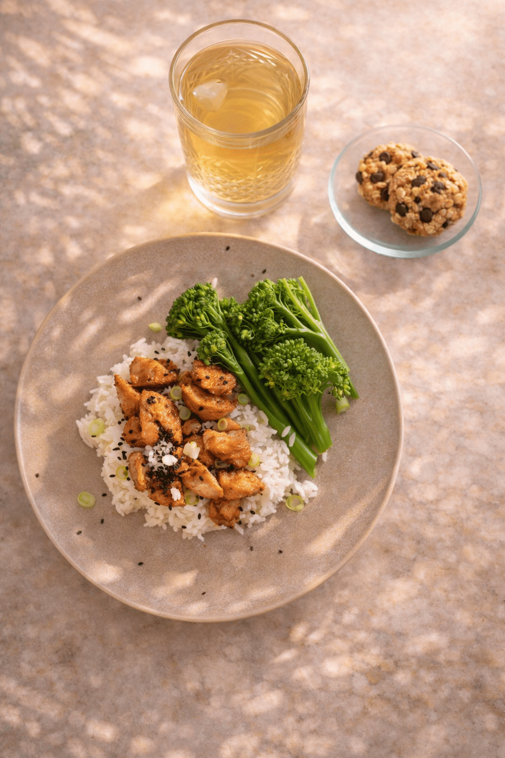 • Serve the teriyaki chicken over rice and garnish with scallions and sesame seeds, with broccolini, banana oatmeal cookies, and iced ginger tea.