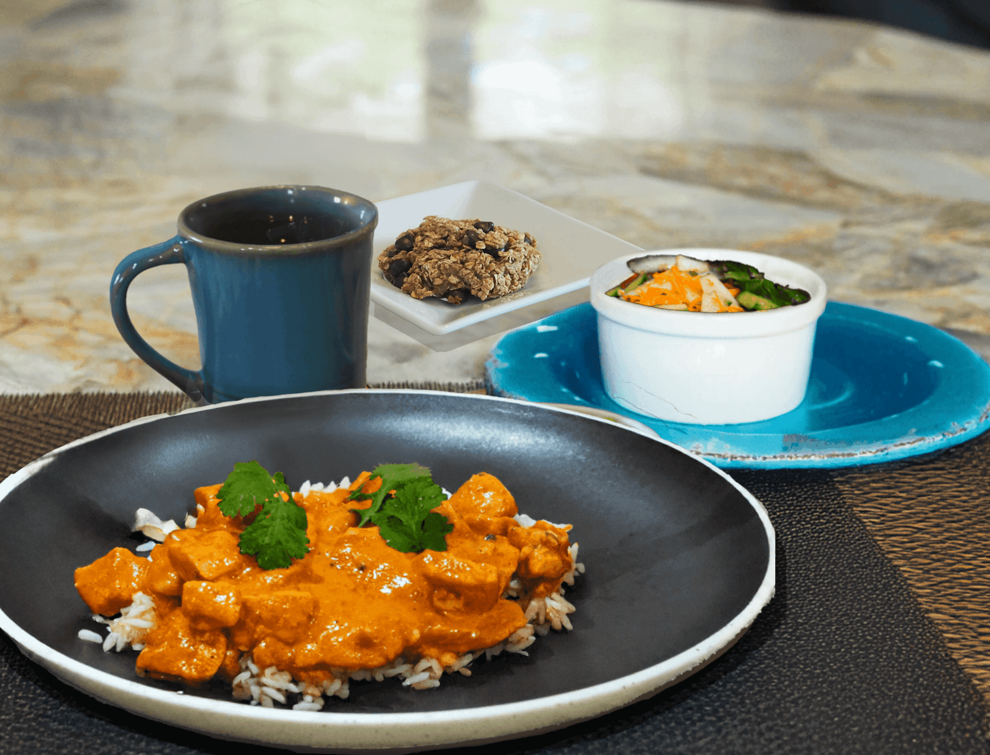 - Serve the chicken over rice and garnish with chopped cilantro. Serve with cucumber salad, cookies and chamomile tea.