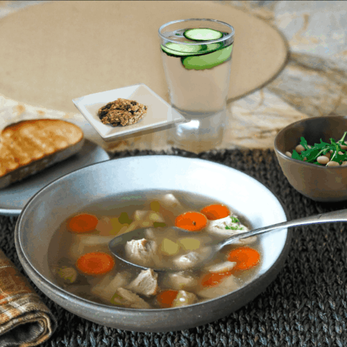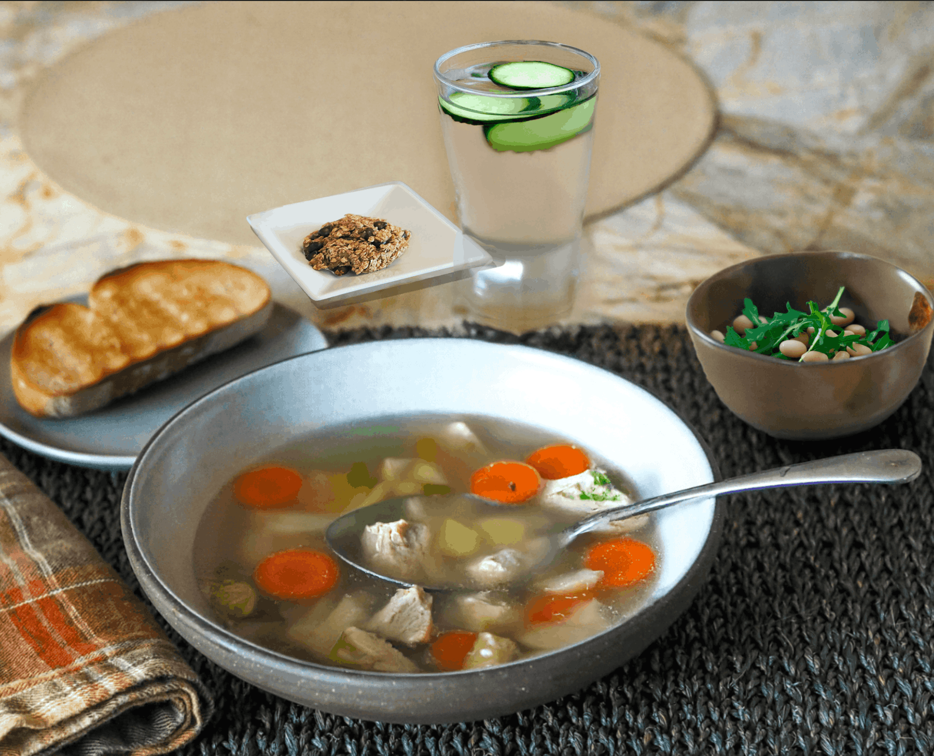 - Serve the chicken and vegetable soup with bread and butter, arugula white bean salad, cucumber water, and banana oatmeal cookies.