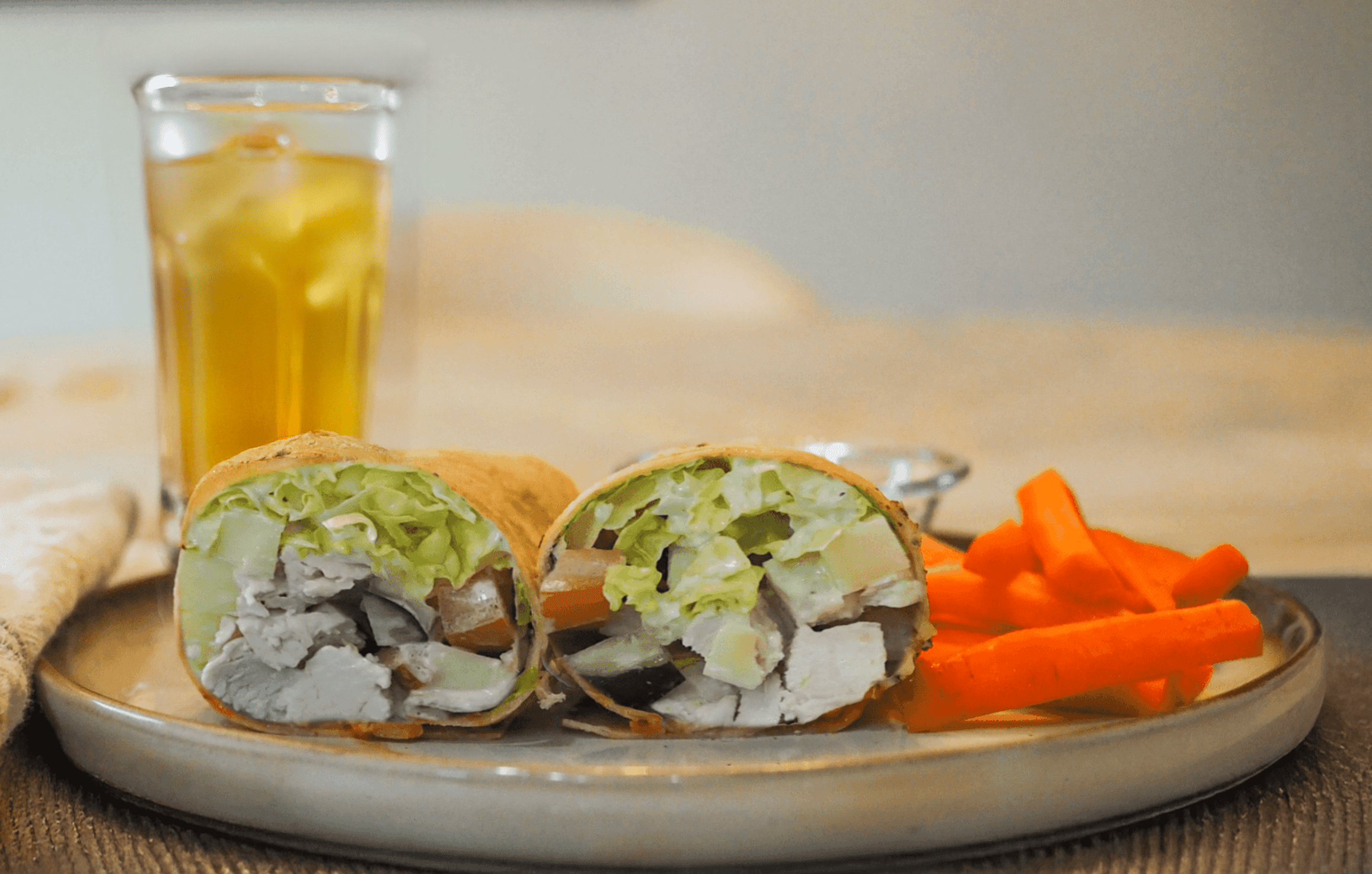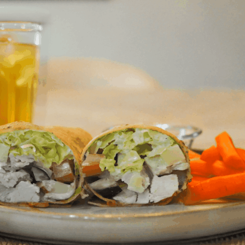 - Serve the wraps with carrot sticks, hummus, pickle spears, and iced ginger tea.