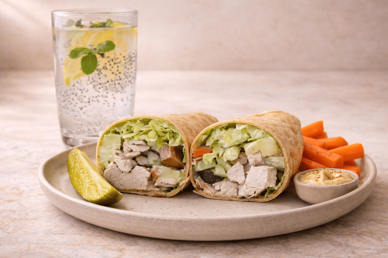 • Serve the wraps with carrot sticks, hummus, pickle spears, and chia fresca.