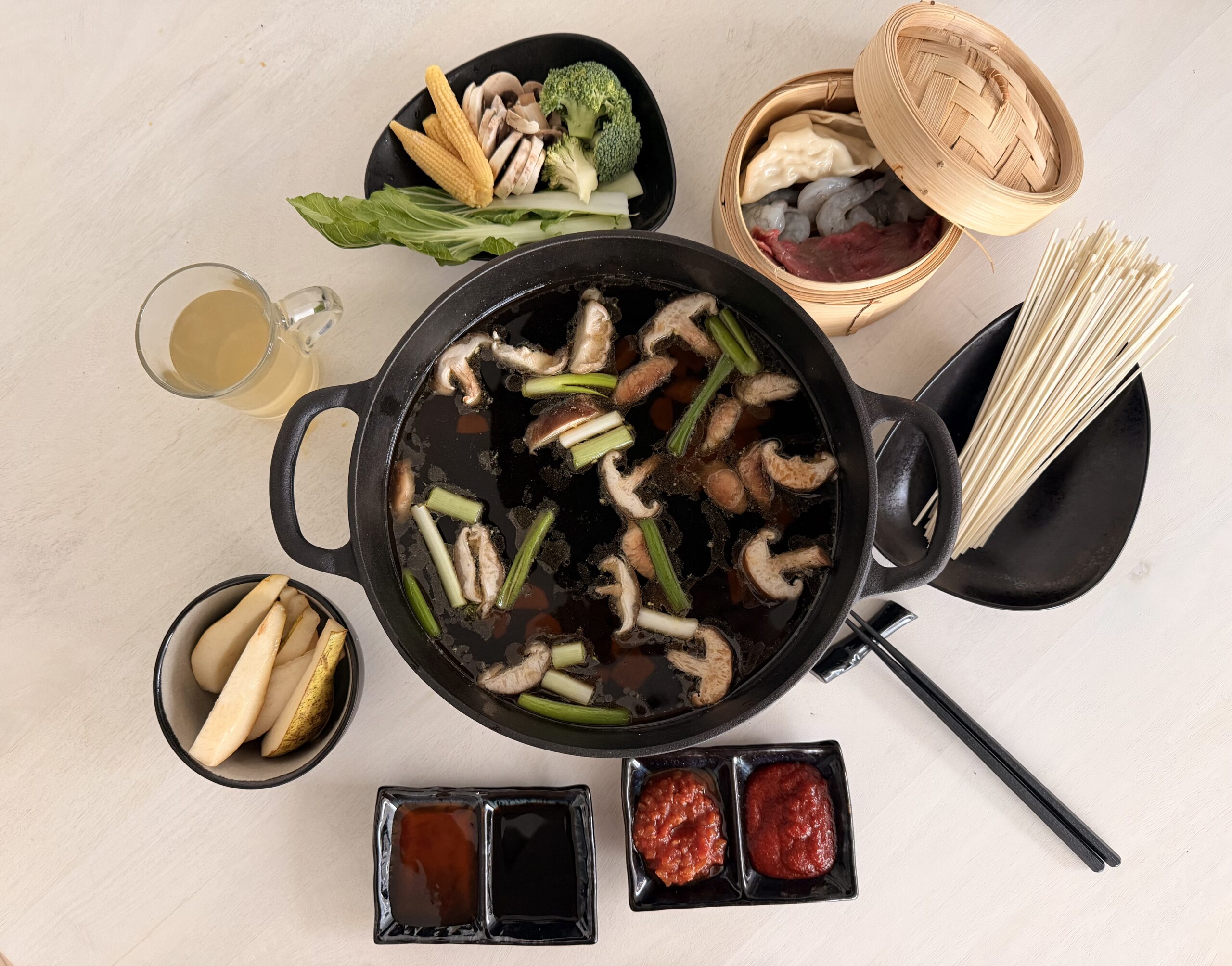 - Portion the vegetables, steak, shrimp and dumplings. Dip into preferred sauces (soy sauce, ponzu, chili garlic, sriracha) as preferred. Enjoy with pear slices and ginger tea.