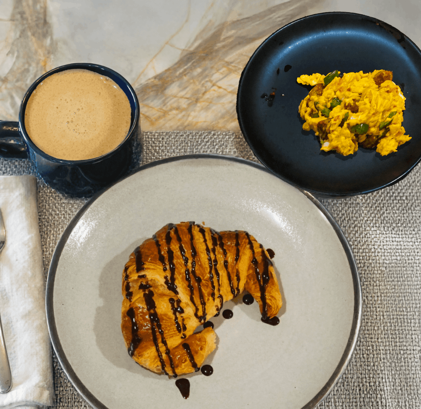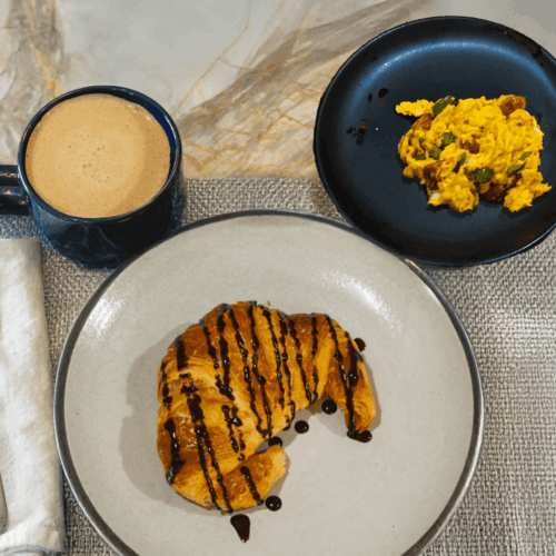 - Serve the scrambled eggs alongside the chocolate croissants and coffee.