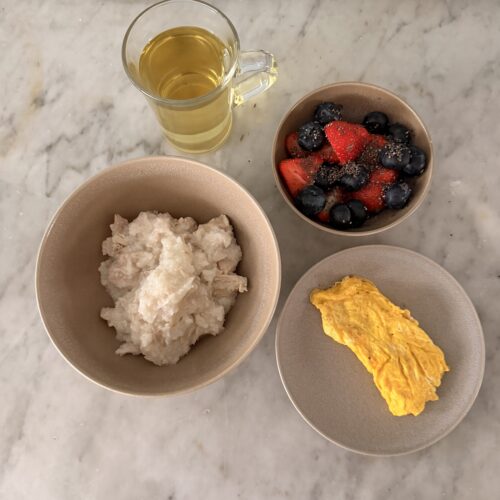 - Portion congee and serve with scrambled eggs, berries with chia seeds, and green tea.