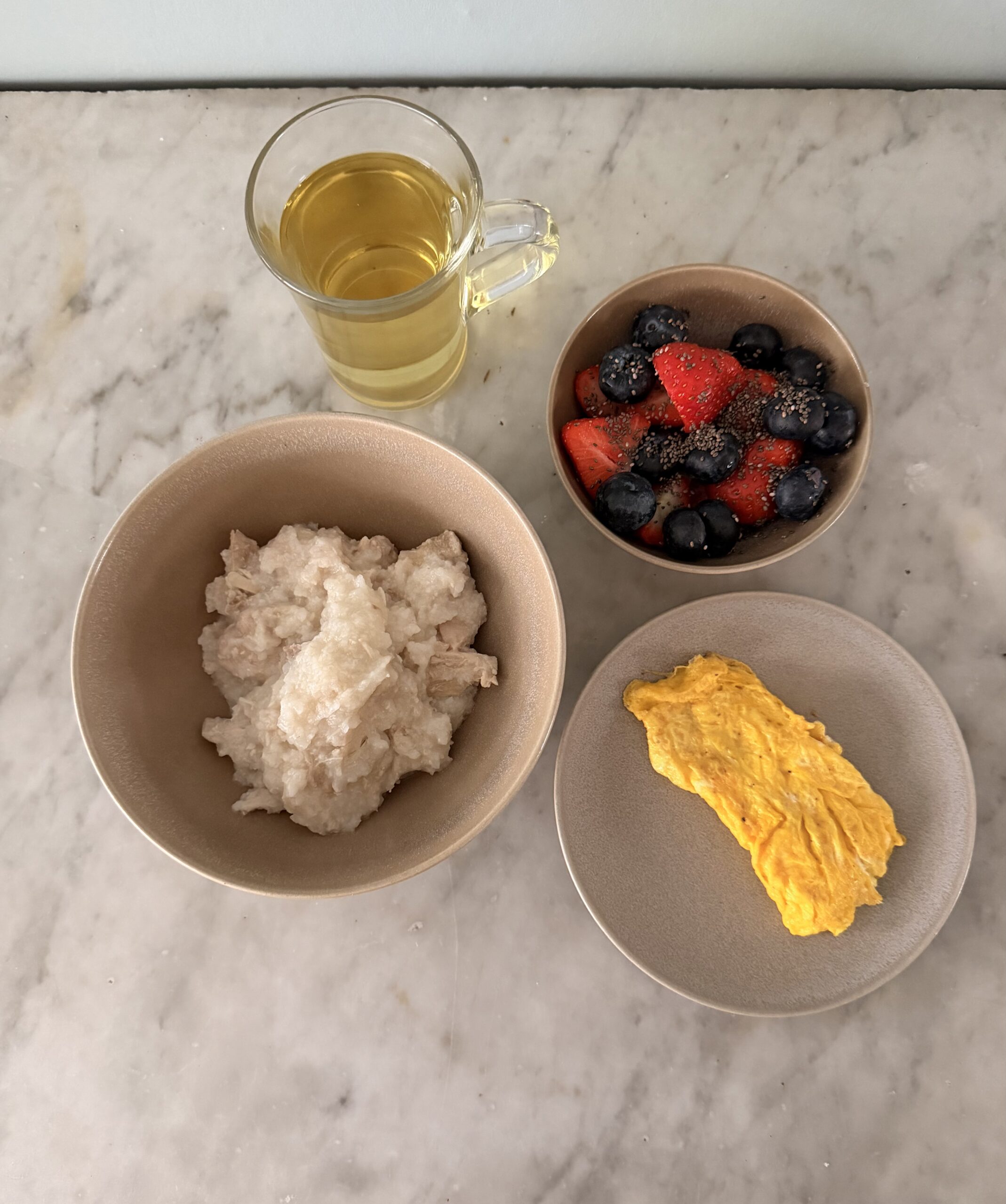 - Portion congee and serve with scrambled eggs, berries with chia seeds, and green tea.