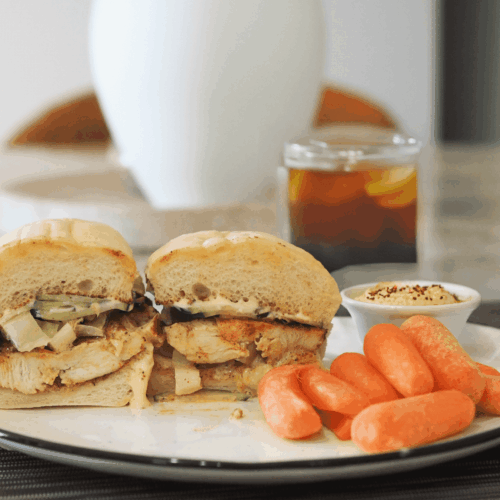 • Slice the cooked chicken into strips. Layer the chicken on the toasted rolls, then top with a scoop of cucumber salad. Close the sandwiches and cut each in half.