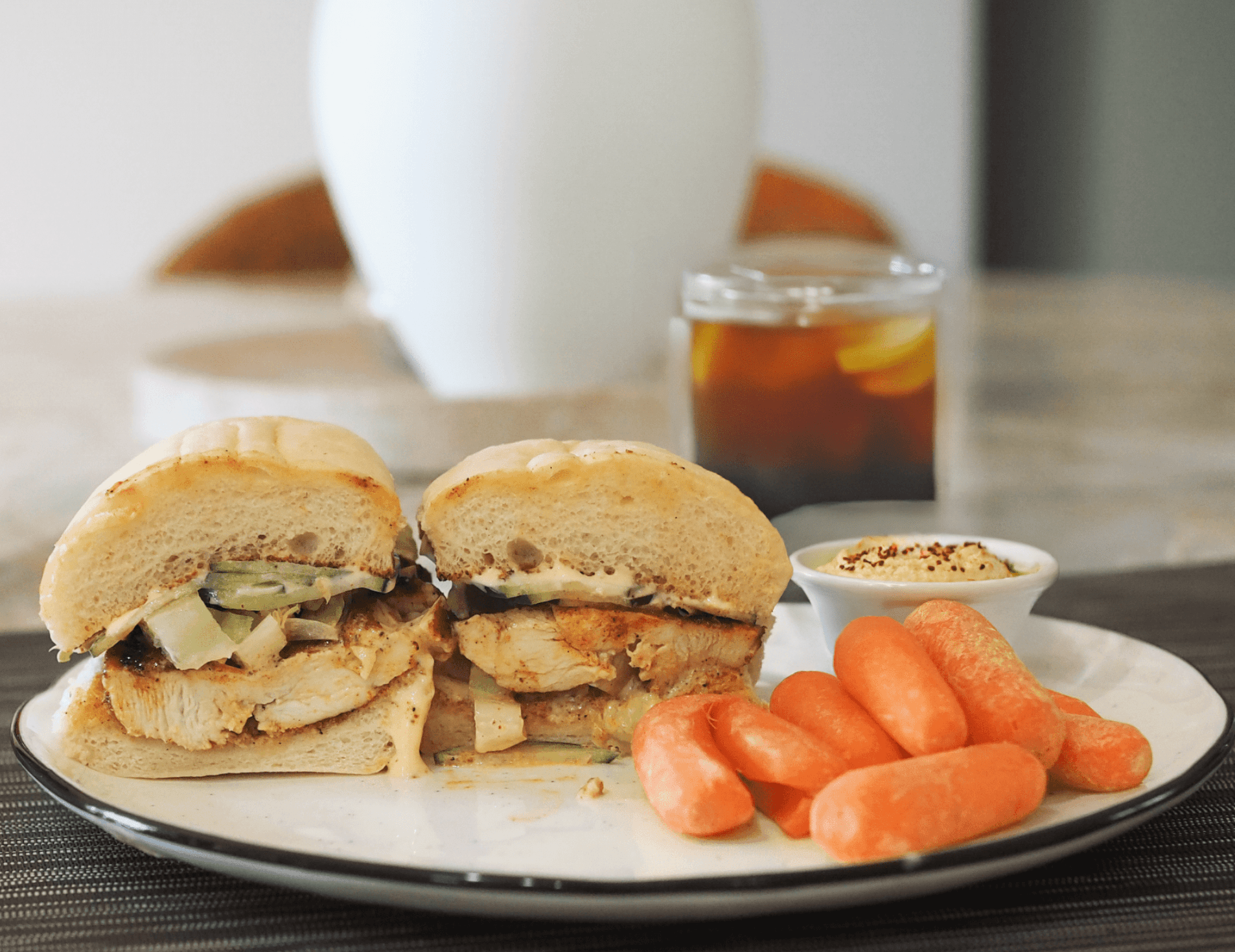 • Slice the cooked chicken into strips. Layer the chicken on the toasted rolls, then top with a scoop of cucumber salad. Close the sandwiches and cut each in half.