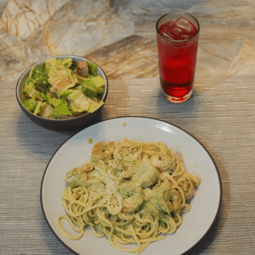 - Serve the creamy pesto shrimp linguine alongside Caesar salad and hurricane cocktai. Enjoy!