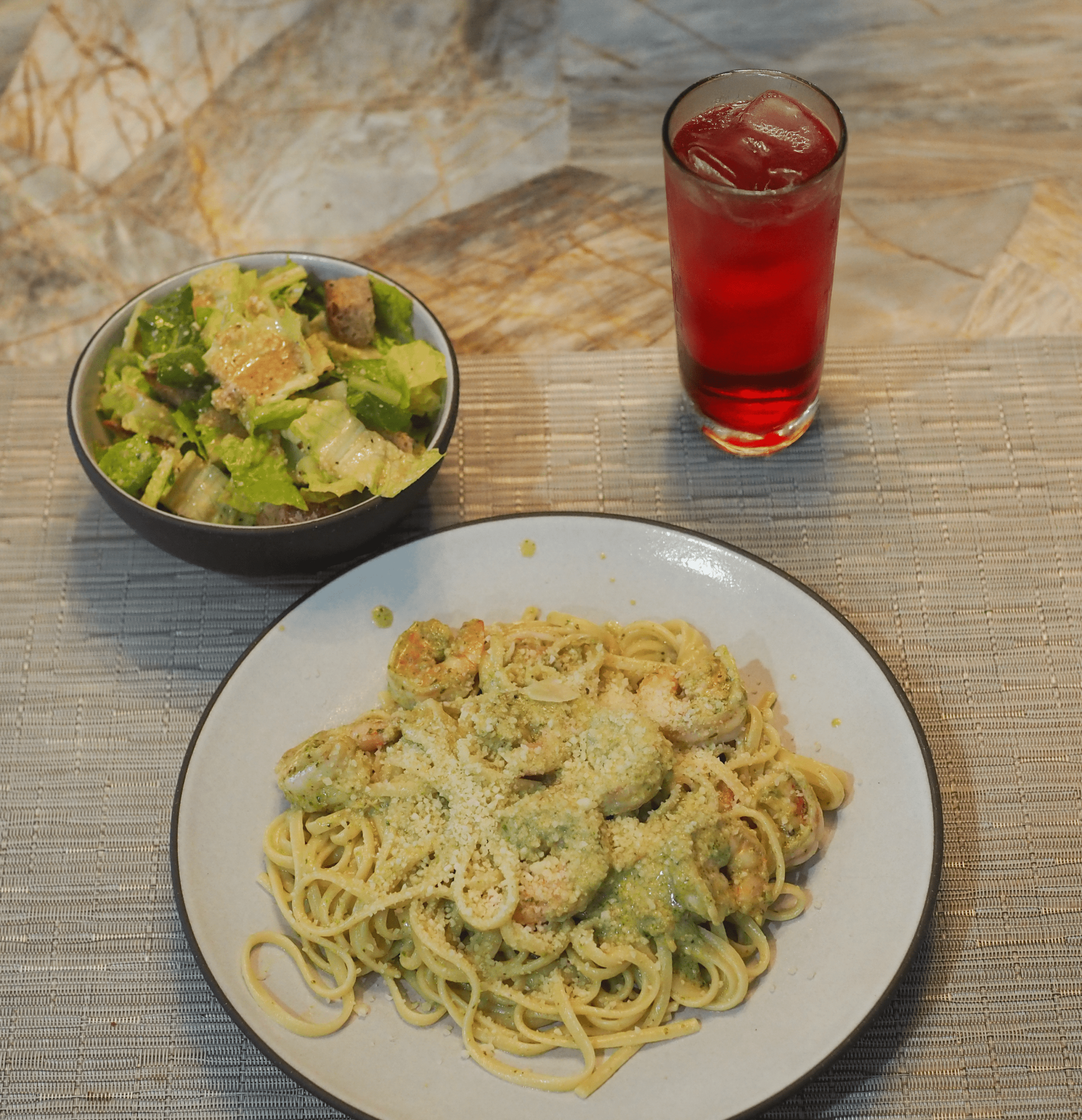 - Serve the creamy pesto shrimp linguine alongside Caesar salad and hurricane cocktai. Enjoy!
