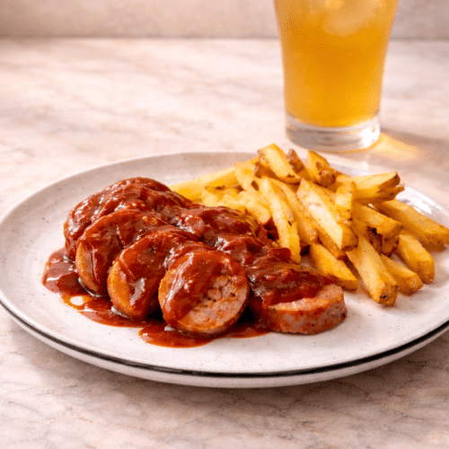 • Serve currywurst with French fries and iced ginger tea.