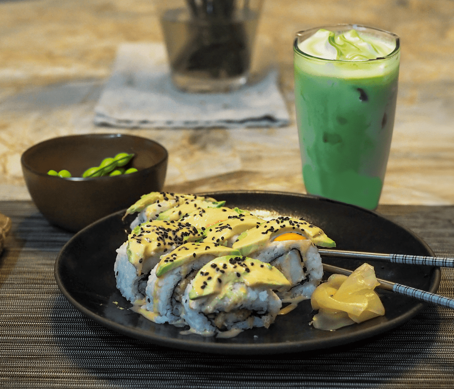 - Serve the sushi with optional soy sauce, pickled ginger, wasabi, along with edamame and matcha latte.