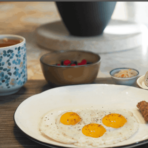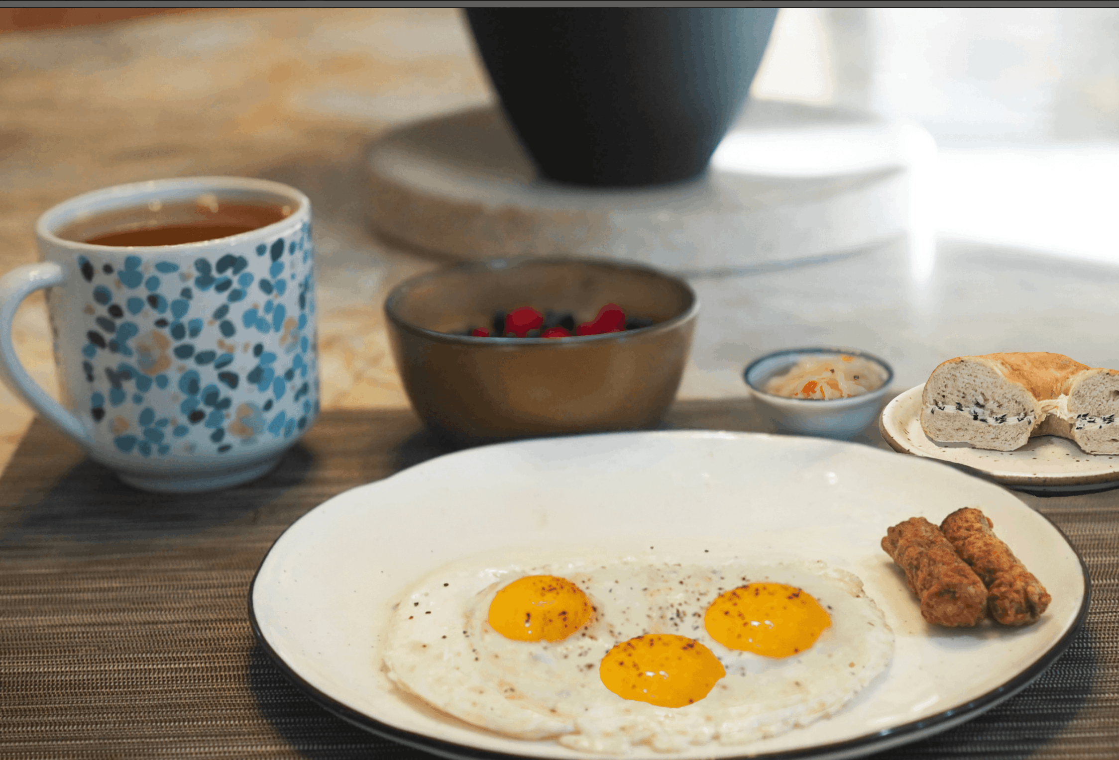 - Serve the eggs with sausage, bagel with cream cheese, warmed sauerkraut, berries, and coffee.