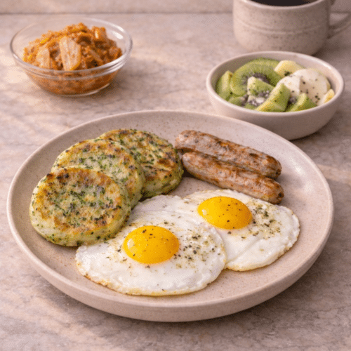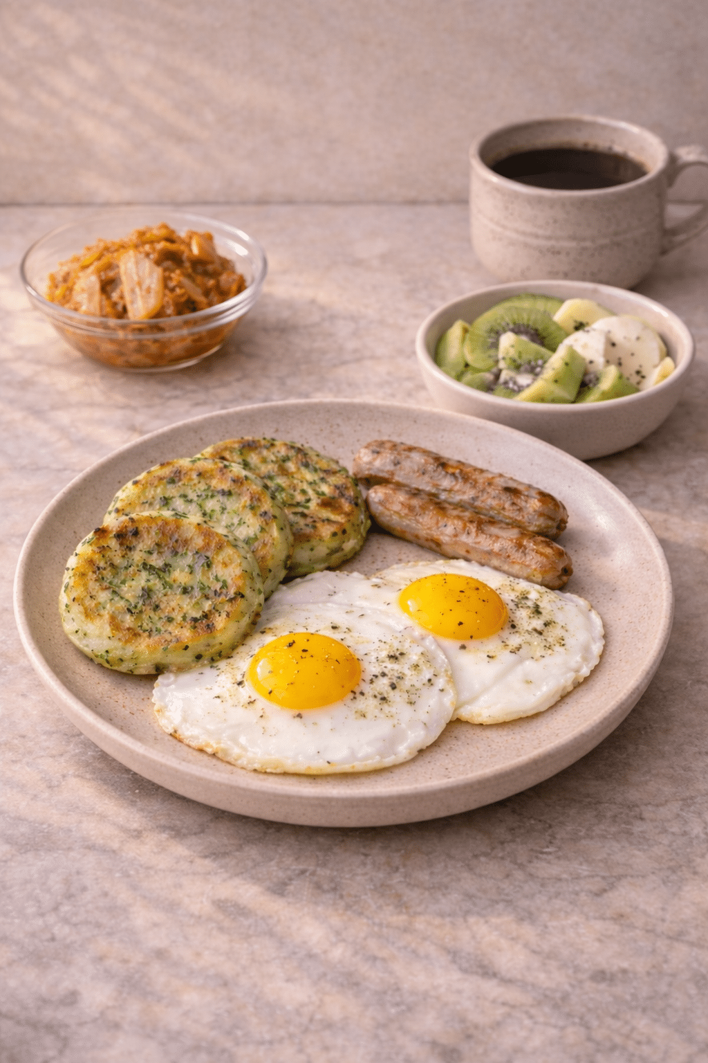 • Serve herb-infused potato pancakes with eggs, turkey sausage, kimchi, fruit, and coffee.