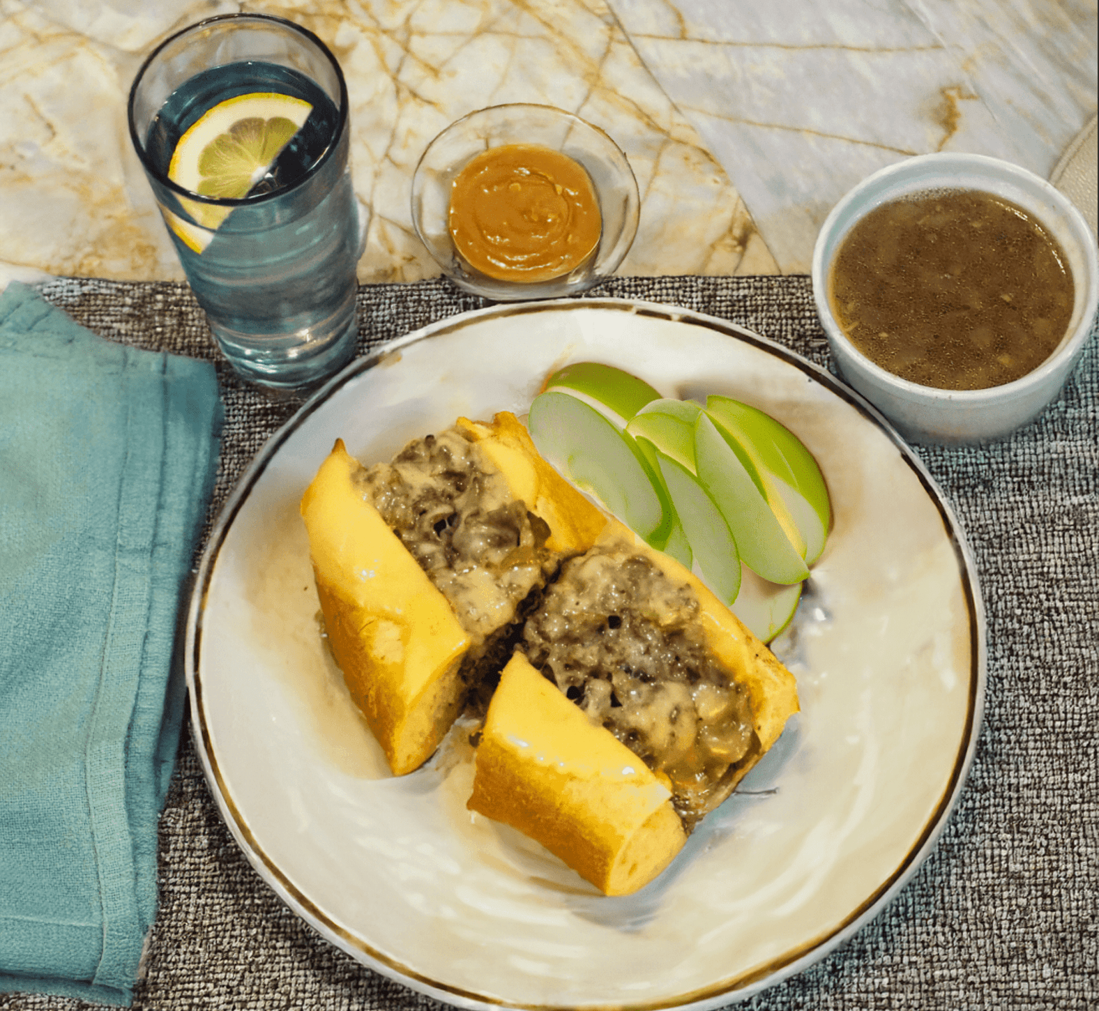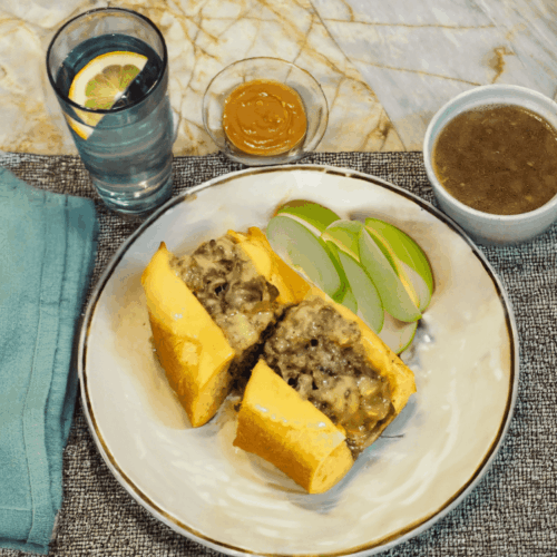 • Serve the sandwiches warm with the reserved au jus on the side for dipping, along with apple slices, peanut butter, and lemon sparkling water.