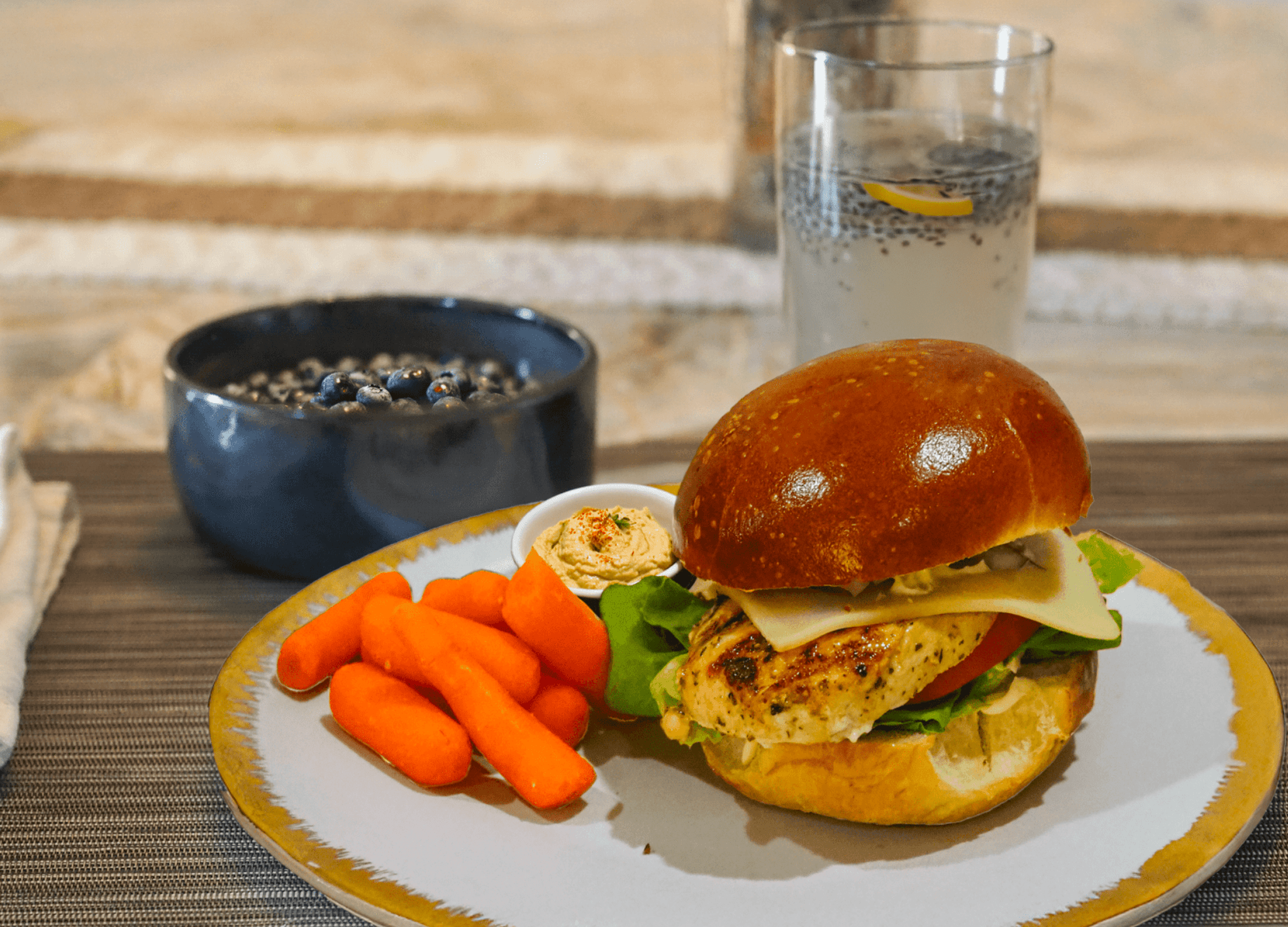 - Serve the sandwich with carrot sticks, hummus, fresh blueberries, and the lemon chia sparkling water.