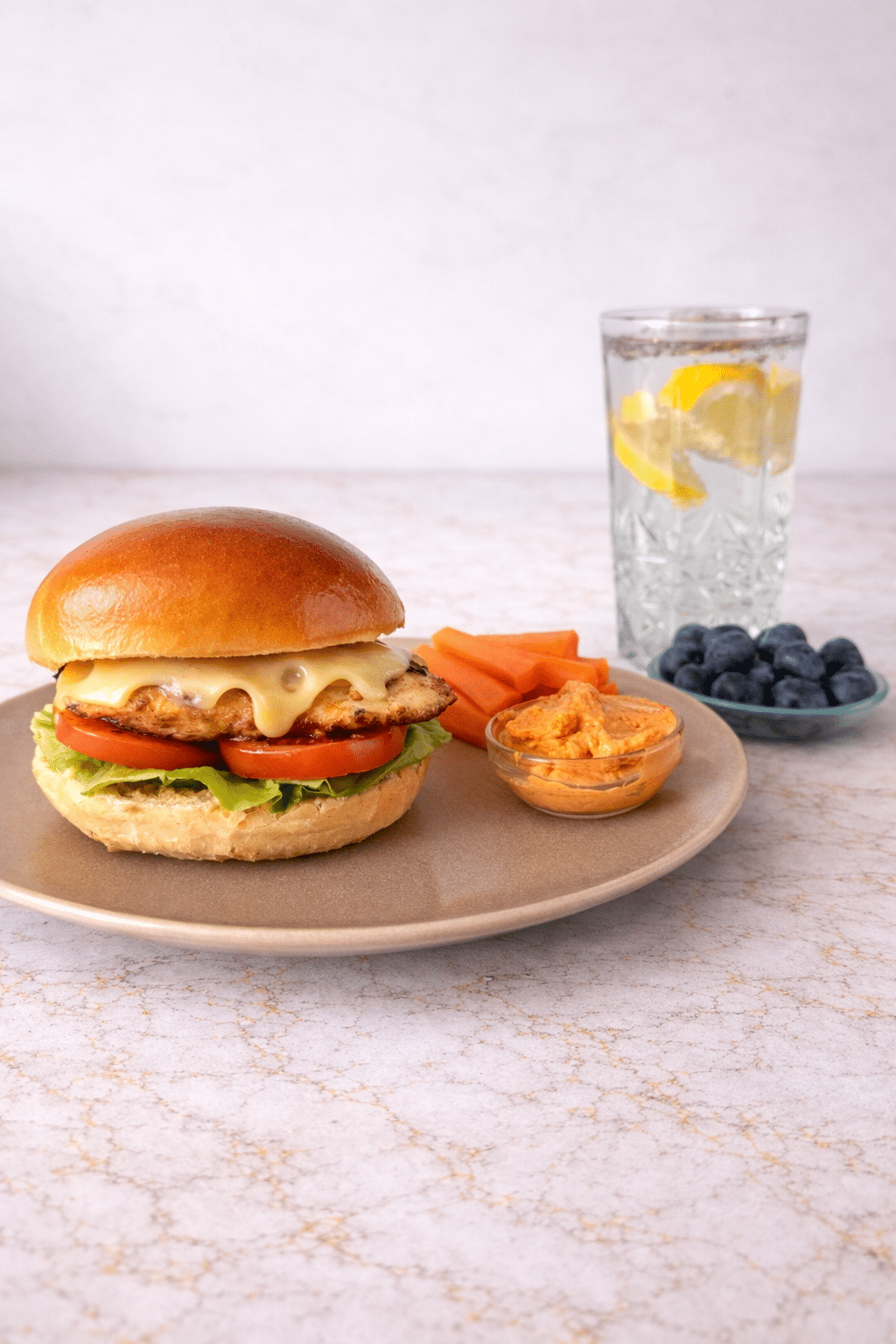 - Serve the Greek grilled chicken sandwich with carrots and hummus, blueberries, and the lemon chia sparkling water.