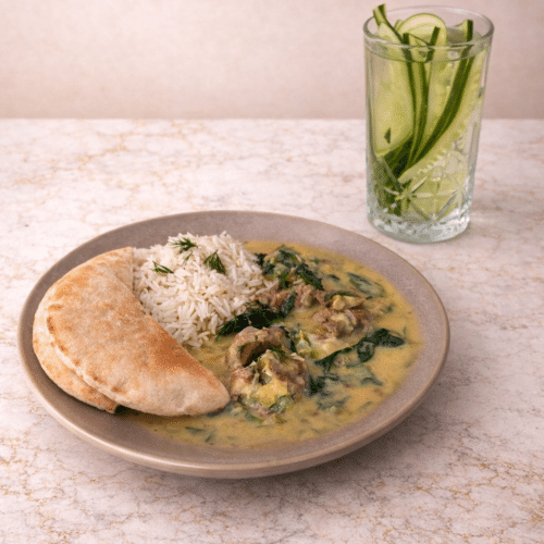 - Portion the lamb fricassée, and serve with rice, pita, and cucumber water. Garnish with some chopped dill.