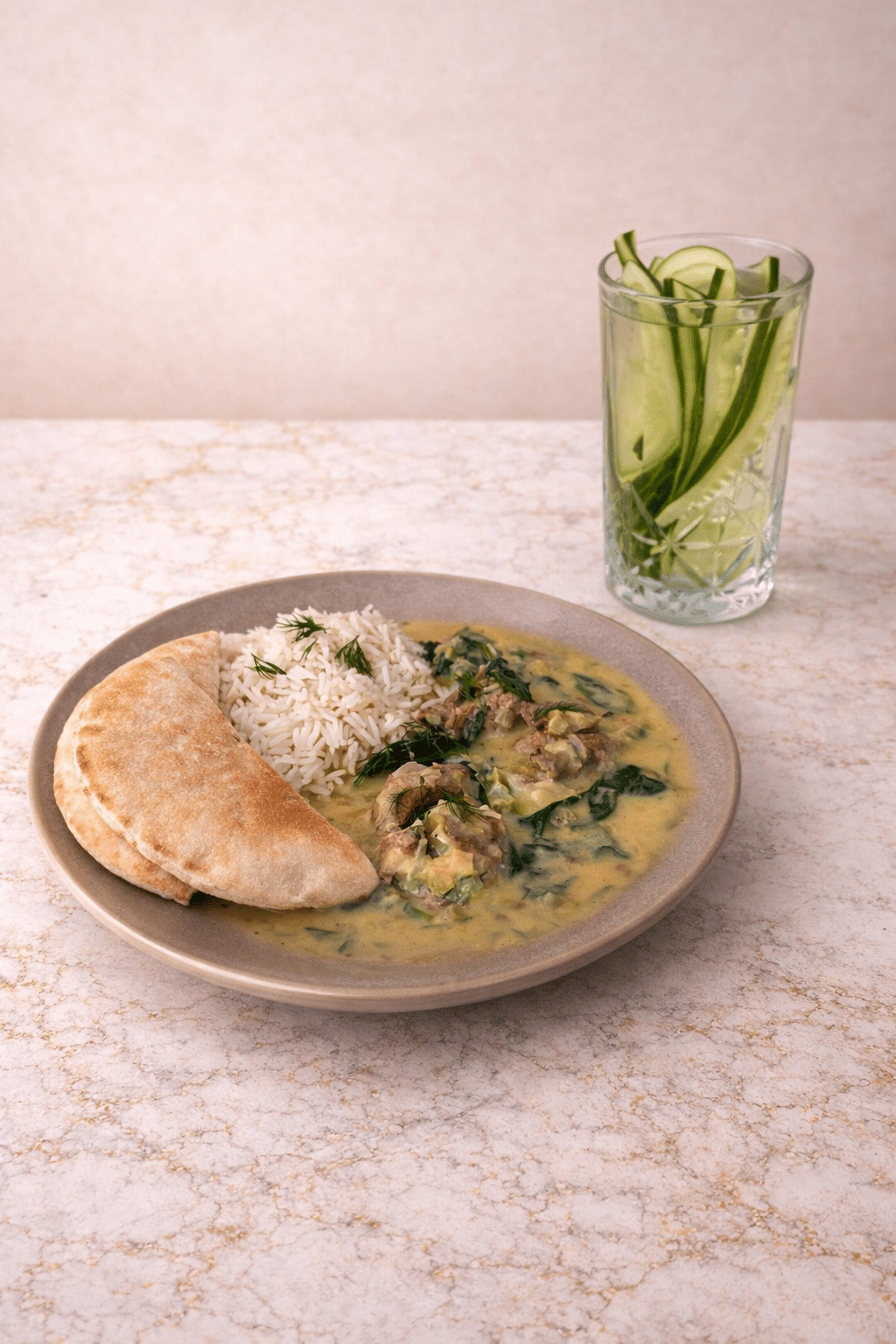 - Portion the lamb fricassée, and serve with rice, pita, and cucumber water. Garnish with some chopped dill.