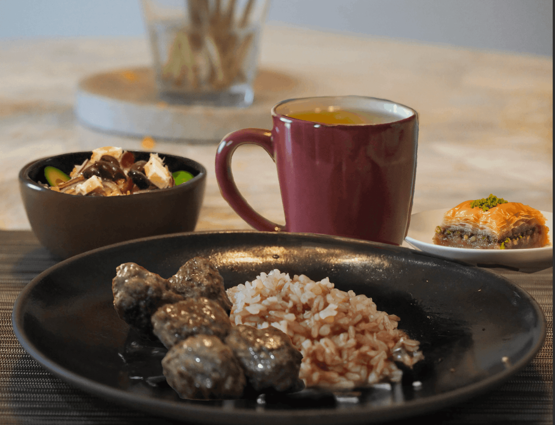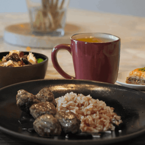 - Serve the meatballs with brown rice pilaf, Greek salad, chamomile tea, and baklava for dessert.